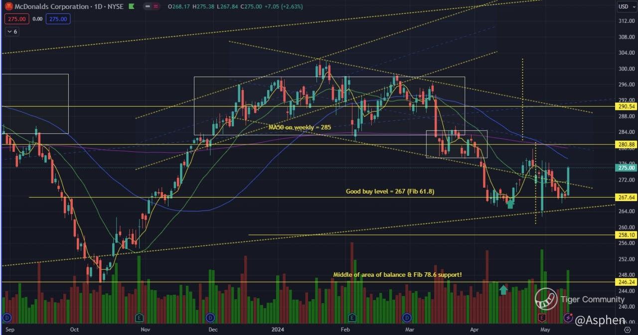 - After accumulating from 267 and letting go at 290, was anticipating MCD to pull back to Fib 61.8