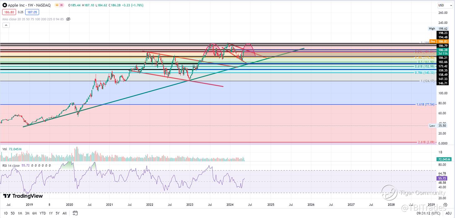 AAPL has been trading in a series of higher highs and higher lows. Notice how it has held the dark green support trendline since 2018.
