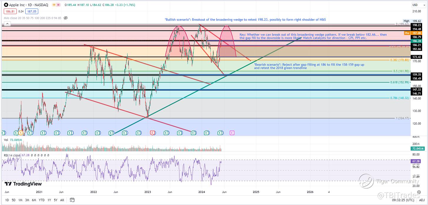 AAPL is currently trading in what seems to be a descending broadening wedge reversal pattern, after making new ATHs at 199.62. What happens next largely depends on the reaction at the 186 level: