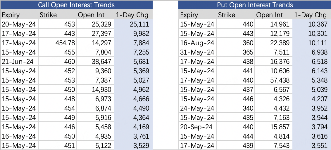 For put options, investors sold the most $QQQ 20240515 440.0 PUT$ with a 440 strike, adding 10,000 contracts. This implies expectations capping downside in QQQ below 1.3% by May 15 expiration.