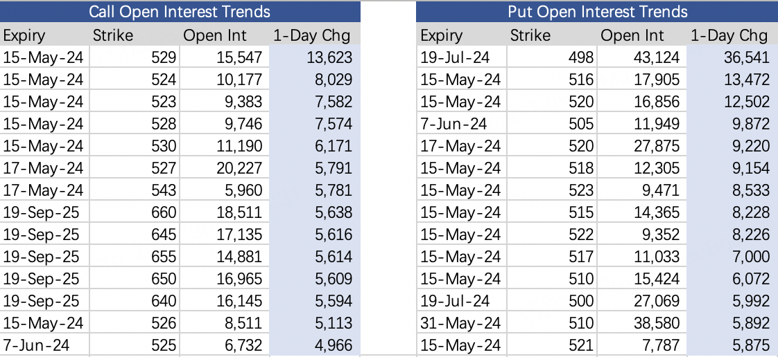 For call options, investors sold the most $SPY 20240515 529.0 CALL$ with a 529 strike, adding 13,000 contracts. This implies expectations capping upside in SPY below 1.1% by May 15 expiration.