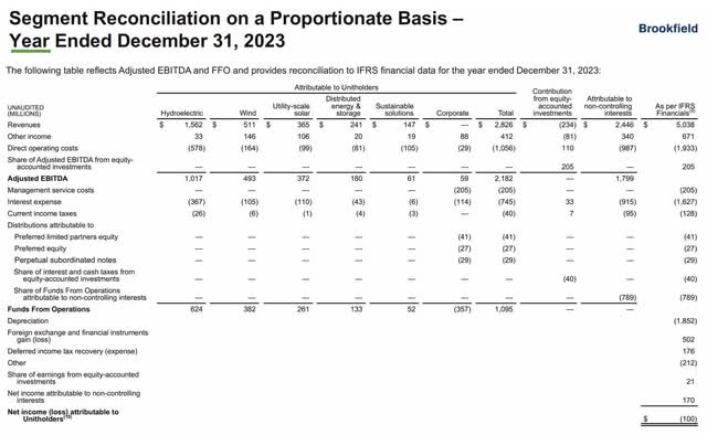 This deal will bring significant incremental FFO and revenue into the picture and we can put this in perspective by looking at the current FFO and revenue for solar and wind. Before we do so, it is helpful to clarify the difference between proportionate numbers and consolidated numbers in the financial tables. Slide 24 of the 4Q23 supplemental shows proportionate FFO for 2023 was $1,095 million on proportionate revenue of $2,826 million. Consolidated numbers are shown on an IFRS basis and there isn’t any standardized meaning prescribed by IFRS for FFO. As such, consolidated FFO isn’t shown while consolidated revenue is $5,038 million: