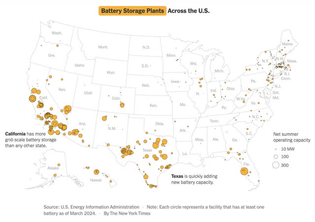 Per the New York Times, California and Texas lead the way with battery storage but other states are on the move and this map will continually change as Brookfield and others provide more solar/battery combinations for hyperscale cloud companies: