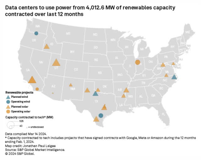 The prospects for Brookfield are enticing given recent developments. Canary Media says Arizona recently added its biggest grid battery to date for a Google (GOOGL) (GOOG) data center. A March 2024 S&P Global article says datacenter hyperscalers secured over 4,000 MW of renewable capacity in the 12 months ending February 1st. Amazon (AMZN), Meta (META) and Google were cited for these 24 projects::