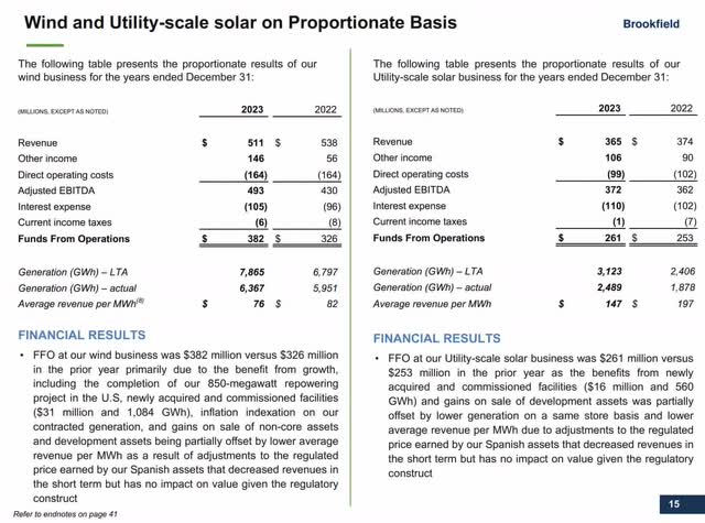 Per the 4Q23 supplemental, Brookfield had 2023 utility-scale solar revenue of $365 million on 2,489,000 proportionate MWh such that the average revenue per MWh was $147. The 4Q23 supplemental says the average revenue per MWh for wind in 2023 was $76 when adjusted to net the impact of power purchases:
