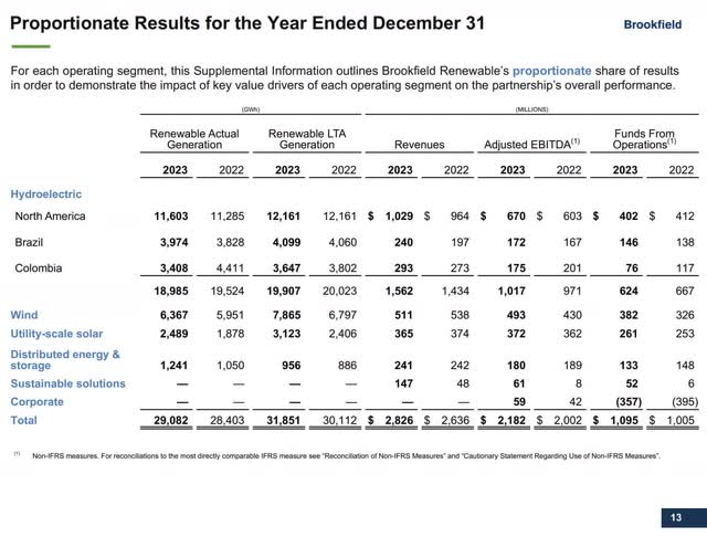 This agreement with one counterparty/offtaker, Microsoft, is prodigious on a relative basis. Looking at Brookfield’s consolidated numbers for all offtakers/buyers in 2023, they had 92,054 LTA GWh in total which came from 38,095 GWh hydro plus 35,759 GWh wind plus 15,211 GWh utility-scale solar plus 2,989 GWh distributed energy & storage. The above LTA numbers including the 92,054 GWh total are based on a December 31st year-end basis whereas the lower LTA number of 75,584 GWh in the highlights below is what Brookfield could have done during the year with the assets they owned: