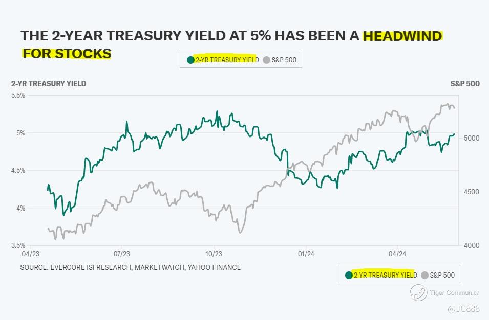 On Wednesday, the 2-year Treasury yield has added about 10 basis points in the past 5 days and is now pressing near the 5% level. (see above)