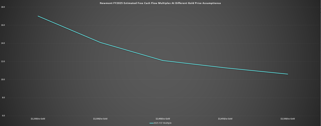 Newmont FY2025 Estimated Free Cash Flow Multiples at Different Gold Price Assumptions - Company Filings, Author's Chart