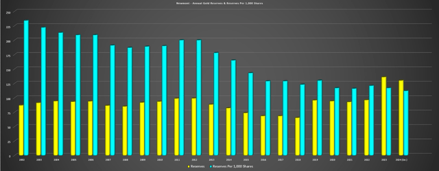 Newmont Annual Gold Reserves & Reserves Per Share - Company Filings, Author's Chart & Estimates