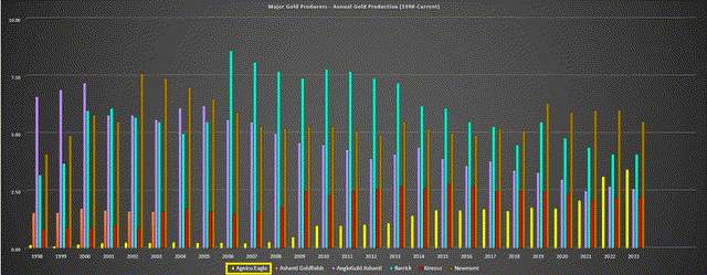 Agnico Eagle Mines vs. Other Major Producers - Annual Gold Production - Company Filings, Author's Chart