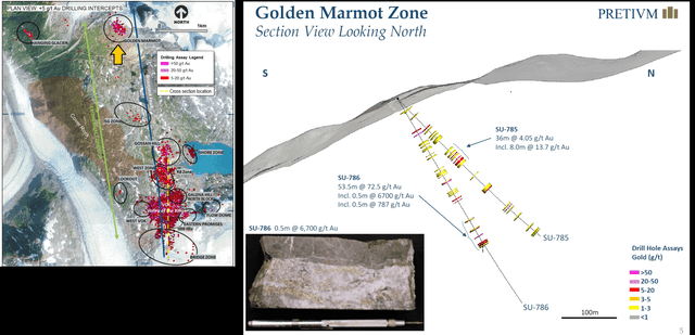 For those unfamiliar with the regional potential at Brucejack, the upside here is quite significant from a resource growth standpoint. This is because prior to Newcrest acquiring Pretium, Pretium discovered a new zone 3.5 kilometers north of its Brucejack Mine that it named Golden Marmot. Initial drilling out of this zone hit 8.0 meters at 13.7 G/T of gold, 0.5 meters at 6,700 G/T of gold, 1.0 meters at 268 G/T of gold, and 1.0 meter at 208 G/T of gold. Follow-up drilling from Newcrest hit 1 meter at 8,000 G/T of gold (best hole to date at Golden Marmot), with continuity established over a 100 meter wide, 200 meter long and 300 meter high area. So, with upside at Golden Marmot and Newcrest confident that it might be onto new opportunities between Golden Marmot and Valley of the Kings (main mining area), there's certainly reason to believe that this is an asset that shouldn't have much issue replacing mined depletion over the medium-term and growing overall resources.