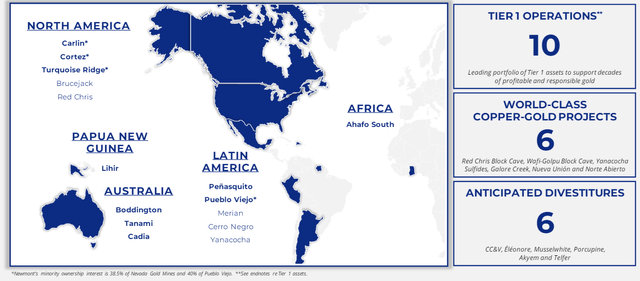 (*) Newmont's core portfolio or the "Tier-1 Portfolio" is made up of larger and lower-cost assets on the below map separate for those it flagged as planned divestments in its 2023 year-end results. If divested, this portfolio would result in a decline of 7.6 million ounces in gold reserves from these non-core assets which make up ~5.6% of gold reserves (*)