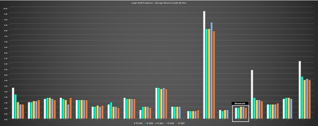 Newmont Average Reserve Grade by Year - Company Filings, Author's Chart