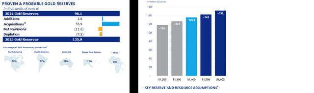 As the charts above highlight, Newmont added 2.8 million ounces of gold from additions, 55.9 million ounces of gold from the acquisition of Newcrest, but this was partially offset by 7.3 million ounces of mining depletion and 11.6 million ounces of net revisions. Negative net revisions were related to changes in regulatory requirements and technical assumptions and Newmont's reserve was based on a $1,400/oz gold price assumption, which was held constant vs. 2022 assumptions.