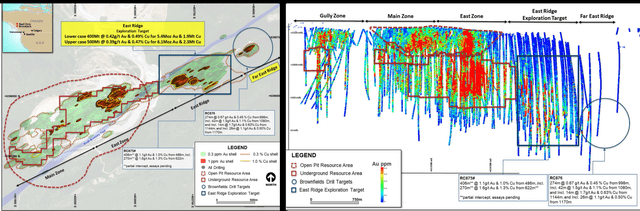 At Newmont's new Red Chris Mine (70% ownership), reserves stood at ~3.9 million ounces of gold at 0.60 grams per tonne of gold and ~2.3 billion pounds of copper at 0.51%, a solid addition to gold/copper reserves in a Tier-1 ranked jurisdiction (British Columbia, Canada). However, this reserve base is backed up by ~4.3 million ounces of gold and ~3.0 billion pounds of copper and there appears to be further upside to this figure longer-term. This is because Newcrest continued to enjoy immense success up until its takeover by Newmont, with high-grade hits at East Ridge and Far East Ridge (east of the main reserve area) that included 406 meters at 1.1 G/T of gold and 1.0% copper (East Ridge) and 274 meters at 0.67 G/T of gold and 0.45% copper (Far East Ridge).