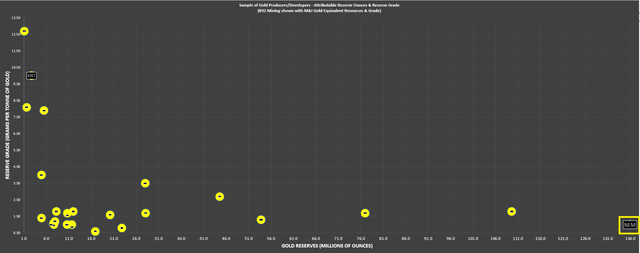 Sample of Gold Producers/Developers - Total Gold Reserves & Reserve Grade Year-End 2023 - Company Filings, Author's Chart