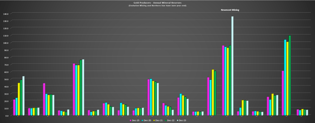 Newmont - Annual Gold Mineral Reserves vs. Peers - Company Filings, Author's Chart
