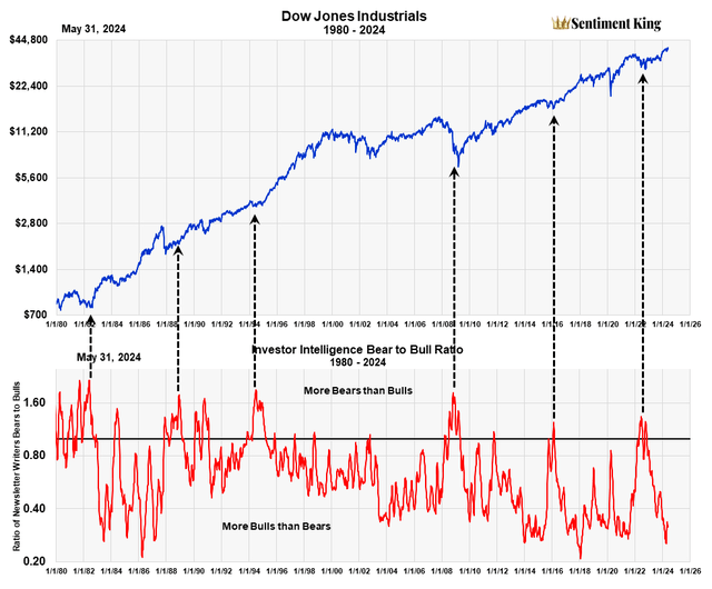 This forty-four year chart of Investors Intelligence, plotted against the Dow Jones Industrials, shows the general truth of these observations.