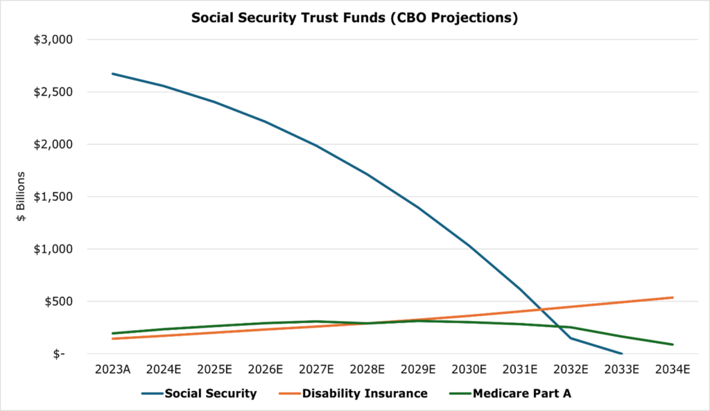 The Old Age and Survivors Insurance Trust Fund is the fund in which Social Security payroll taxes are invested now projected to last until 2033, a year earlier than the 2020 projections. In addition, the Medicare Part A fund is projected to run out some time in 2035.