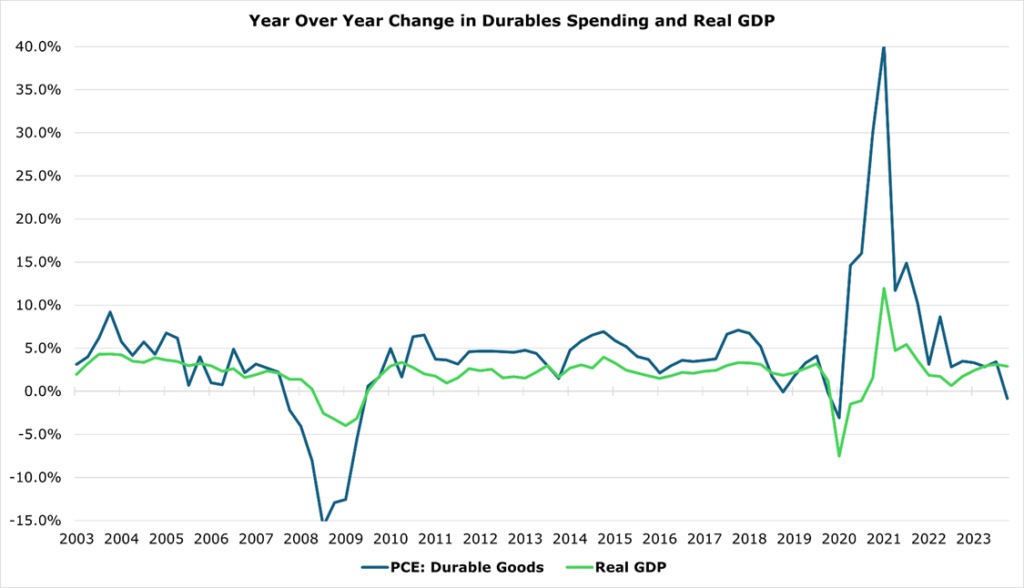 Worryingly, consumer spending on durable goods has seen the weakest results since the quarter ending September 2021, and the first contraction since early 2020. Weak consumer spending on durables is a result of stretched and over leveraged balance sheets and lack of confidence that improvements in their finances will happen in the near future. Consumer spending on durable goods is often considered a leading indicator of recession, as consumers tend to cut out large durable purchases first.