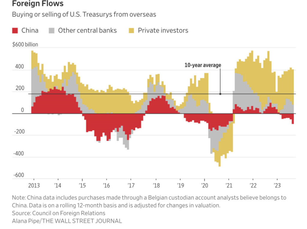 We have discussed in the past the “price-insensitive” buyers of US Treasuries have historically made up a substantial portion of foreign Treasury buyers. These are generally economies that warehouse large amounts of central banking reserves in US Treasuries for stability. The weakness of their currencies against the USD, sanctions, and the desire for multiploarity had put downward pressure on the amount of US Treauries that the developing world – and even some allies like Japan – hold.