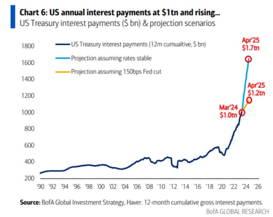 According to a new estimate by Bank of America, if interest rates stay stable for the remainder of the year, the US will pay a total of $1.7 trillion interest through April 2025.