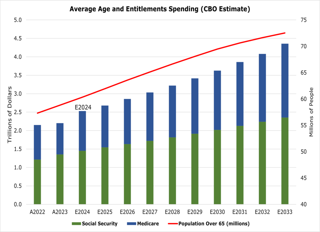 As we have discussed in our article on demographics, spending on entitlements will balloon by an extra $1.5 trillion per year by 2030, with a more drastic change over time as the number of Americans 65 and older will double by 2040.