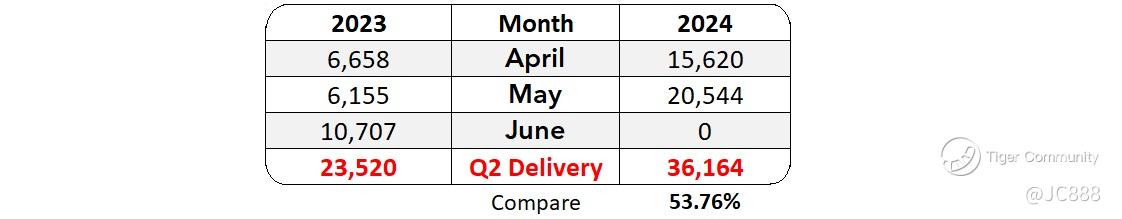 As of end May 2024, Q2 2024 delivery has already exceeded previous year delivery by +53.76%.