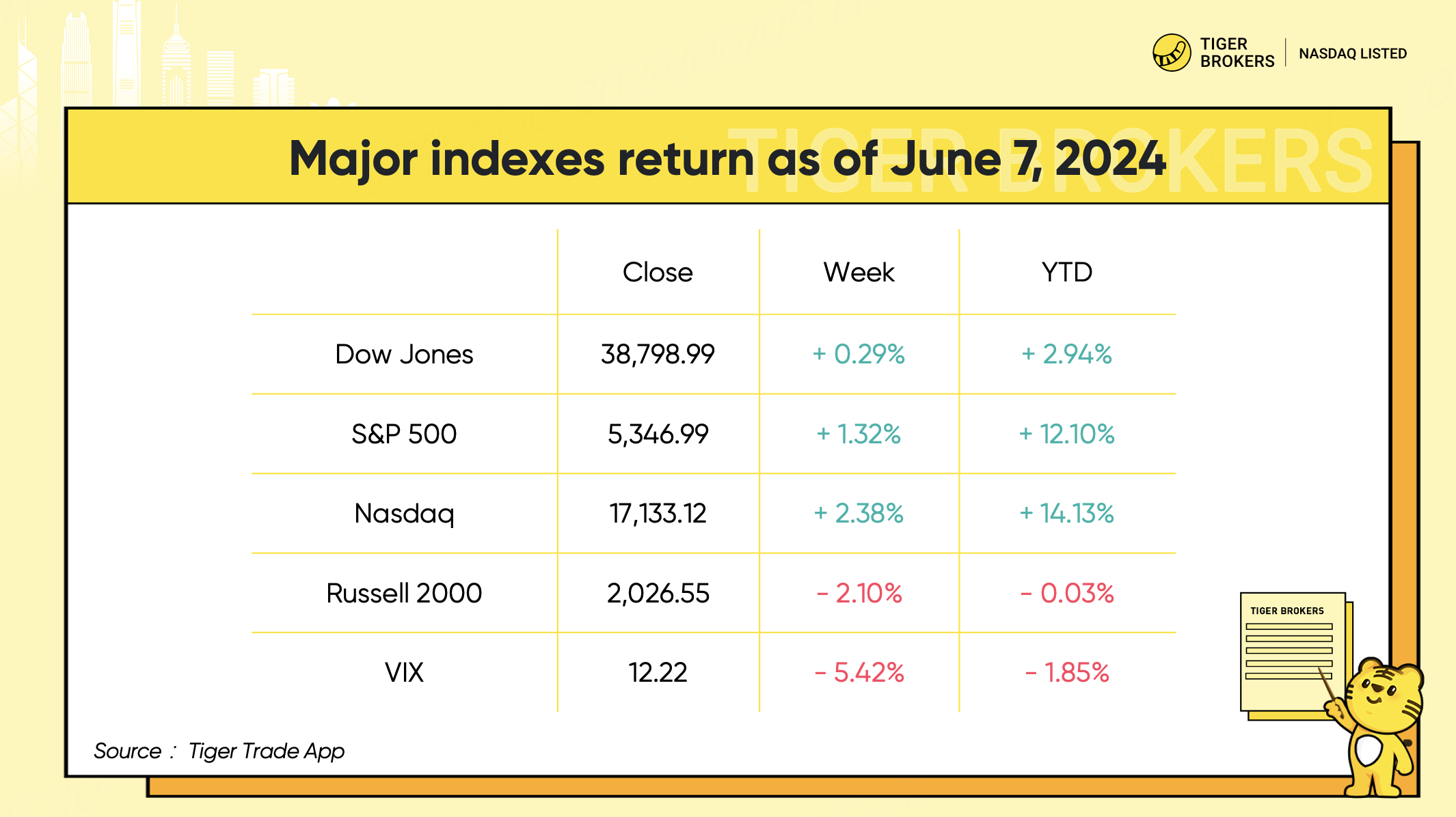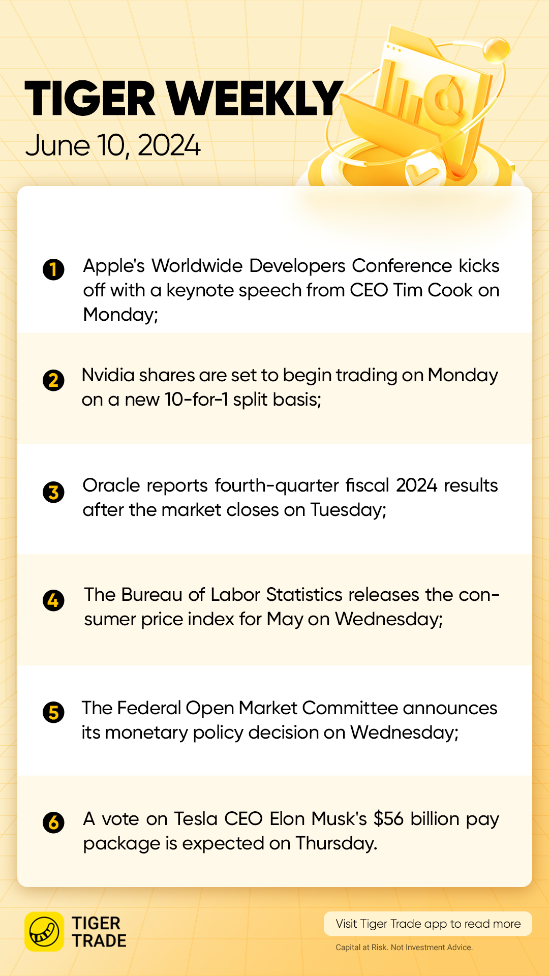 In corporate news, Big Tech will kick off the week with Nvidia's (NVDA) 10-for-1 stock split and Apple's (AAPL) Worldwide Developer's Conference both set for Monday. A vote on Tesla (TSLA) CEO Elon Musk's $56 billion pay package is expected on Thursday.