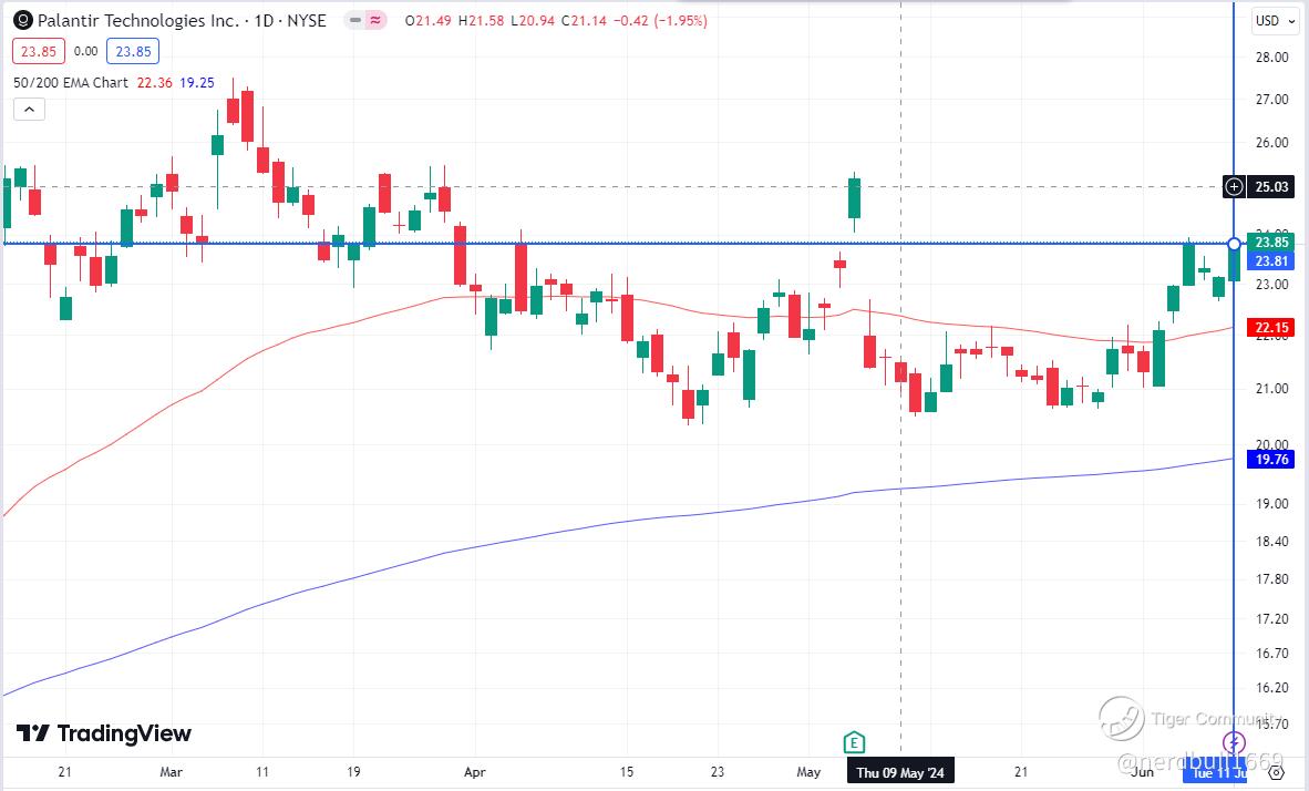 Appreciate if you could share your thoughts in the comment section whether you think Palantir would be able to clear the 23.85 level today (12 June 2024)?