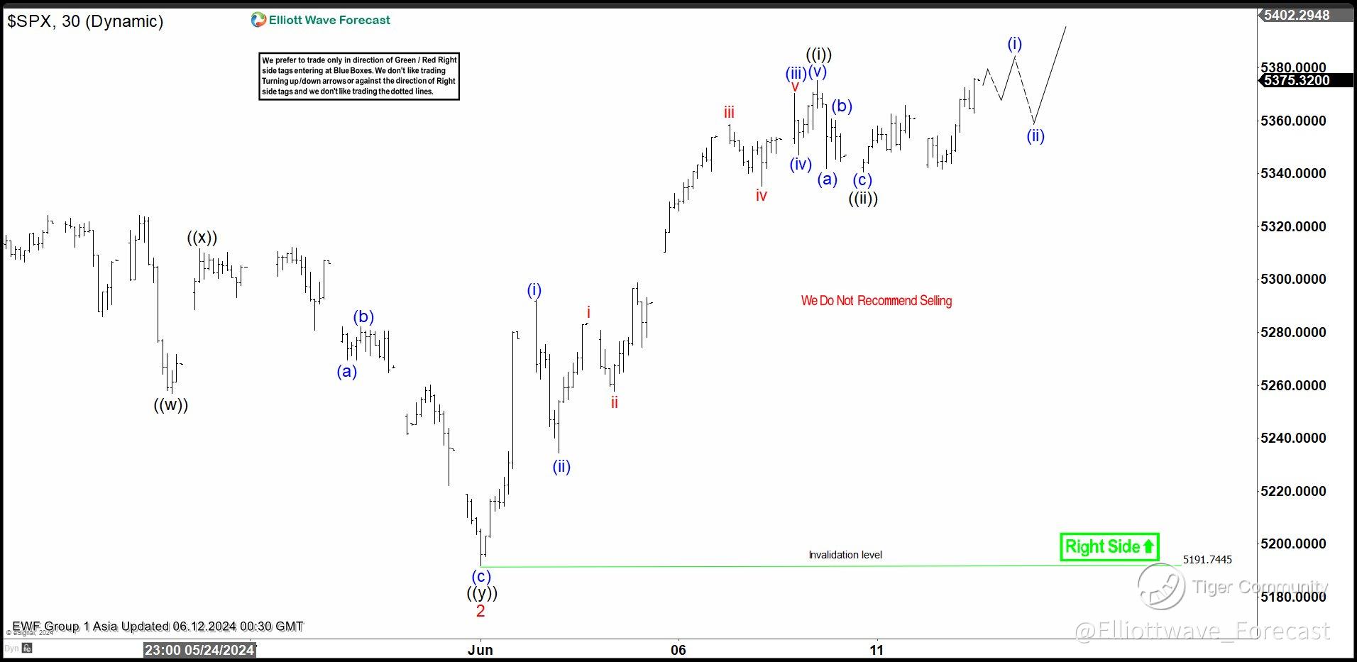 Short Term Elliott Wave in S&P 500 (SPX) suggests the rally from 4.20.2024 low is in progress as an impulse. Up from 4.20.2024 low, wave 1 ended at 5341.88 and pullback in wave 2 ended at 5191.68. Internal subdivision of wave 2 unfolded as a double three Elliott Wave structure. Down from wave 1, wave ((w)) ended at 5256.93 and wave ((x)) ended at 5311.65. The Index then extended lower in wave ((y)) as a zigzag structure. Wave (a) ended at 5269.67, wave (b) ended at 5282.06 and wave (c) ended at 5191.74. This completed wave ((y)) of 2 in higher degree.