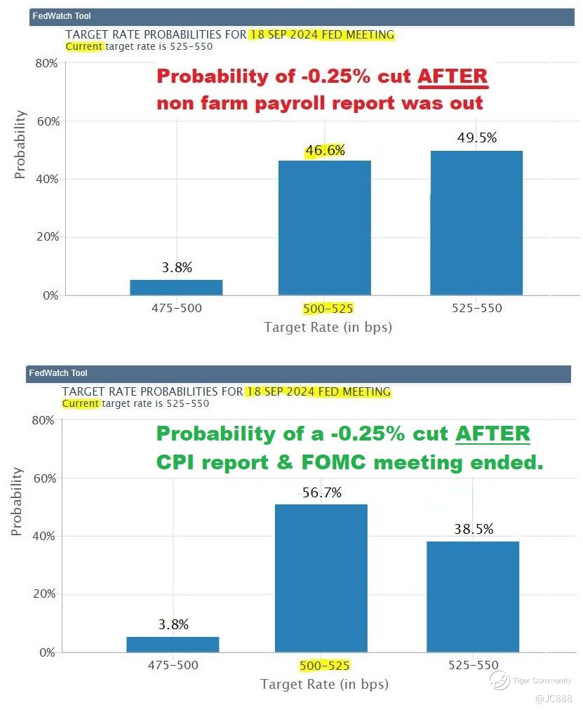 After CPI & FOMC, the probability of a September interest cut has risen by +10.01% to 56.7%. (see above)