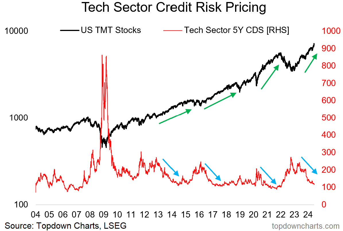 On the other hand, we are in a calming cycle in credit risk pricing. The bearish take would be that CDS pricing is too low and complacent… but historically, falling credit risk pricing has been a bullish sign — the time to be concerned is when it reaches rock bottom and then starts ticking higher. Indeed, it’s quite rare outside of shocks and crashes that credit spreads or CDS just go and spike without warning — they usually give you advance warning by slowly but surely turning first. So arguably this is a sign of bullish momentum for tech.