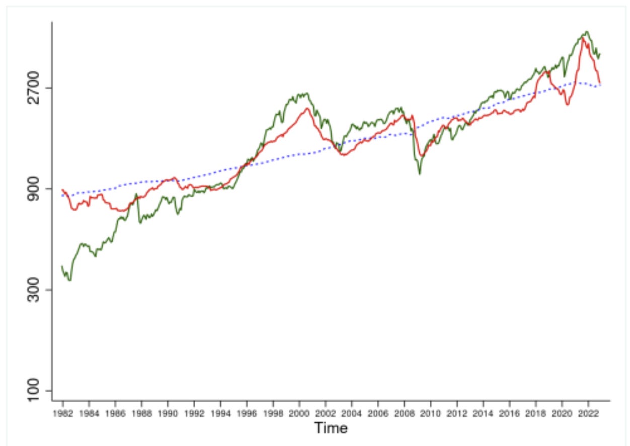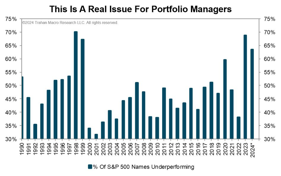 Another sign of narrow leadership is the extent to which individual stocks in the S&P 500 are underperforming vs the index (~2 thirds to May) — this is reaching similar levels as the later more-frenzied stages of the dot com bubble in 1998/99. It makes it harder for stock pickers to beat the index (other than just buying and market timing in the biggest stocks), but it also shows a vulnerability as any weakness in the biggest stocks could unwind all their hard work in dragging the index higher.