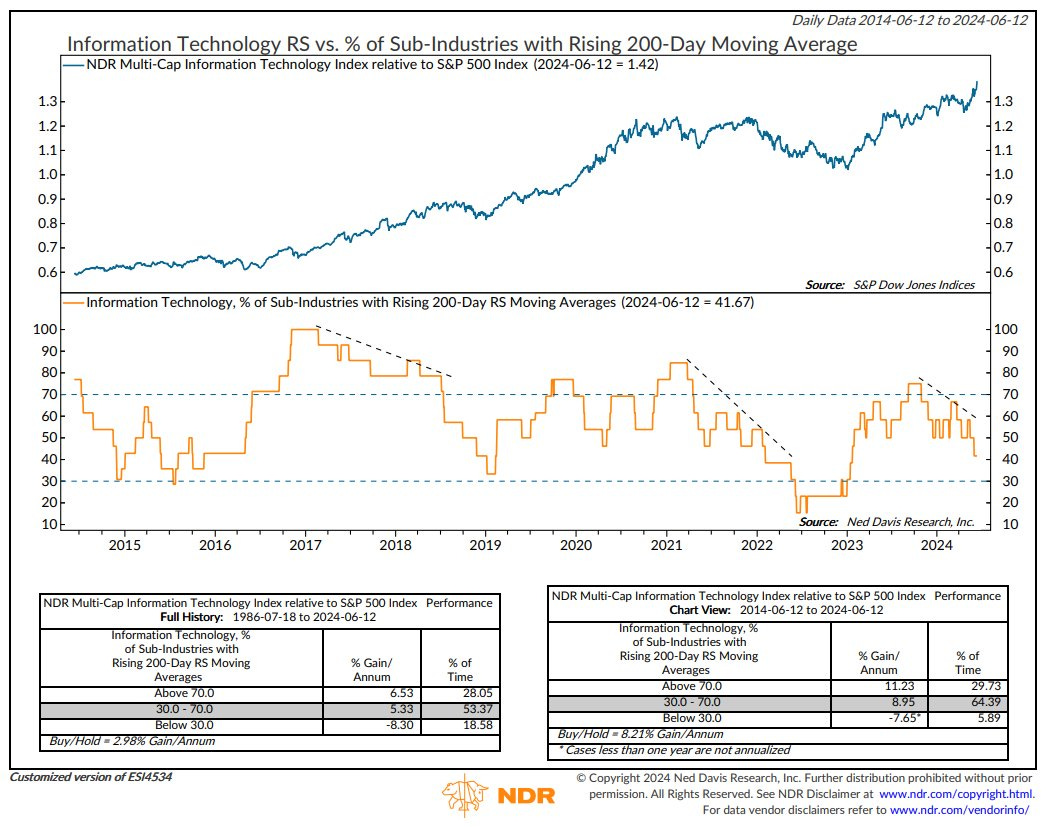 Tech stocks are likewise going from strength to strength on the surface, but meanwhile the breadth of tech sector components shows a picture of relative weakness under the surface, even in tech. Or to put it differently, this is increasingly a market driven higher only by the largest of the largest in Tech.
