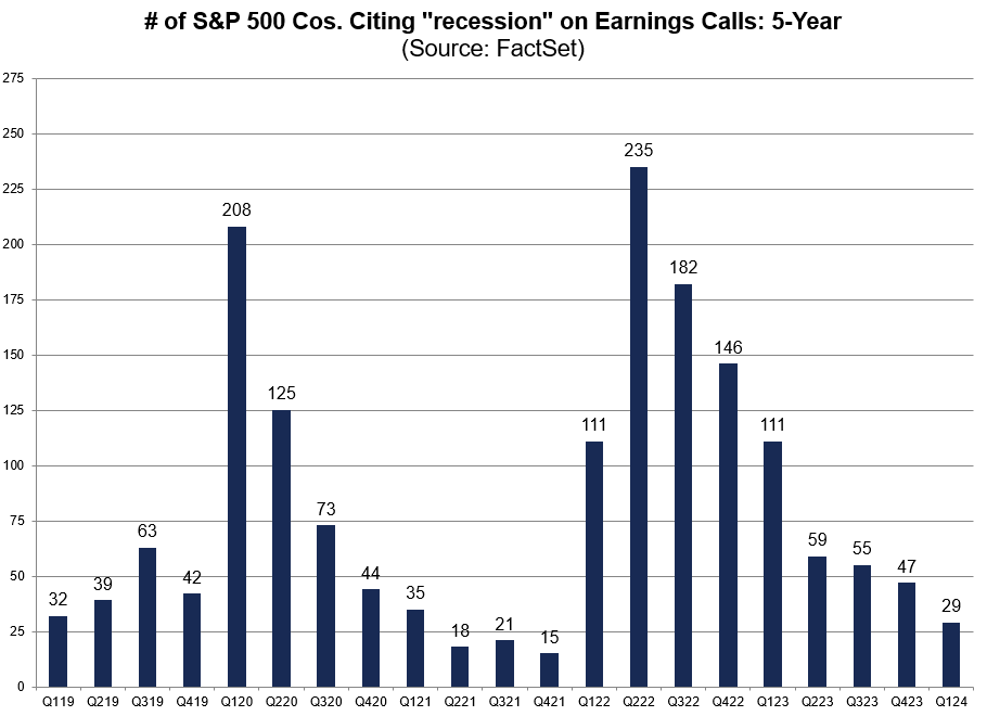 On a similar note, the market has completely climbed over the wall of worry on recession risk. If anything the greater risk now seems to be “reacceleration risk”. That said, at a certain point, much like the previous chart, the lack of chatter on recession will become a contrarian indicator.