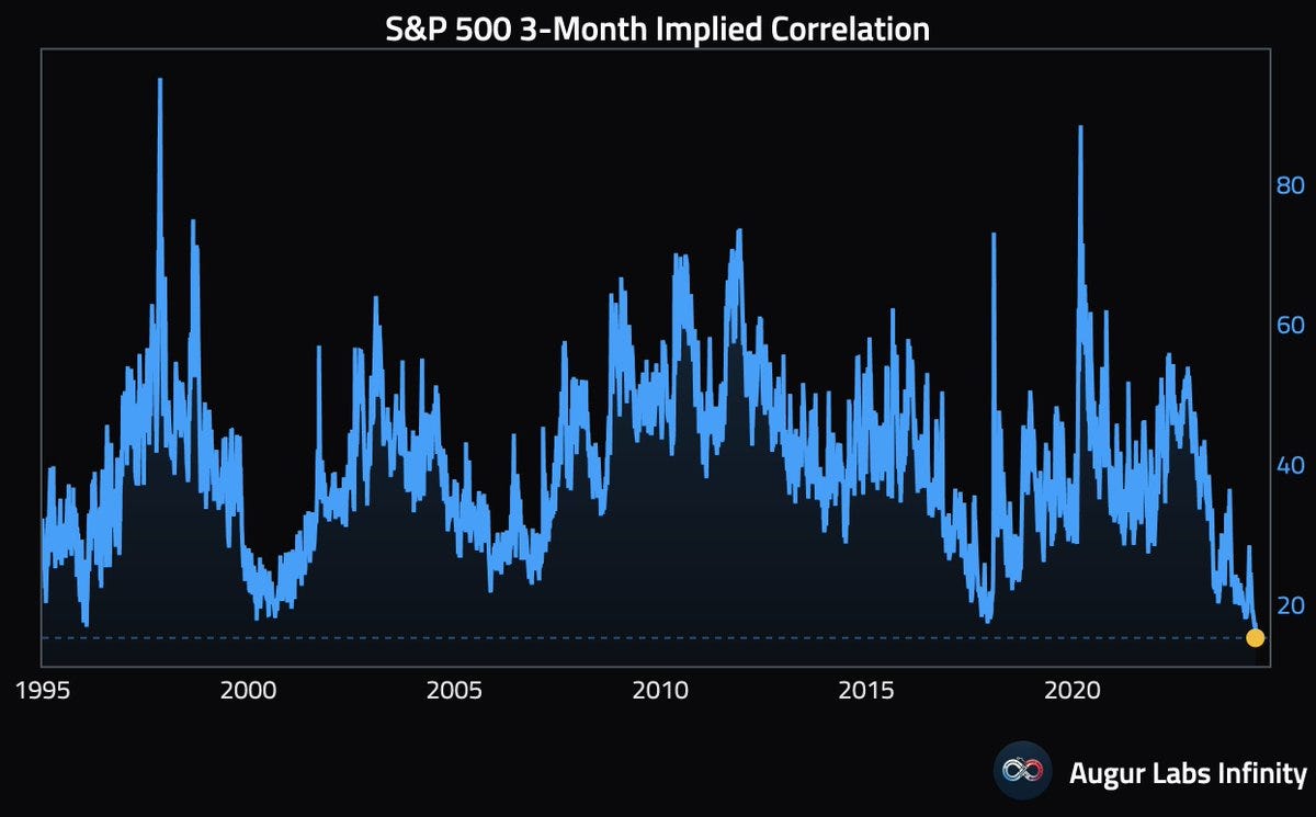 This chart is a great echo of all of the themes we just looked at — it is at once yet another sign of how concentrated the market is and how narrow leadership has been (stock correlations go down when leadership is narrow, a small number of stocks driving it higher — often reflects bubbly conditions in a single sector). It is also a sign of complacency and I would say already at contrarian bearish levels. A warning sign not to be disrespected.