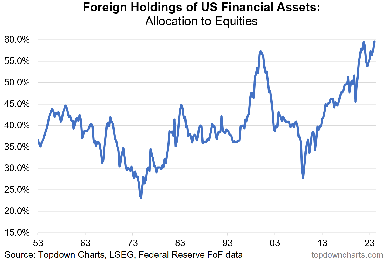 Just updated with the latest data, this indicator has reached a new all-time high. Foreigners are much more inclined to hold US equities vs other holdings of US financial assets. And well, it probably makes sense that they would prefer to hold US Big Tech vs US Big Debt. Probably also a contrarian indicator too though (compare and contrast 2000 peak vs 2009 trough).