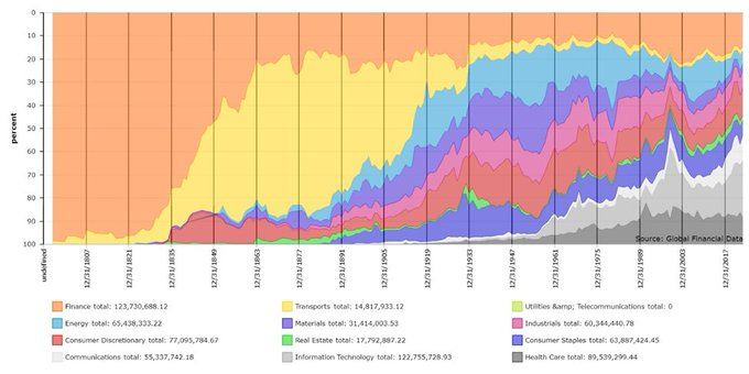 Interesting historical perspective on sector weightings — financials completely dominated in the first part of the 1800’s only to be later edged aside by transports, then to a lesser degree of dominance: energy, and now increasingly tech.
