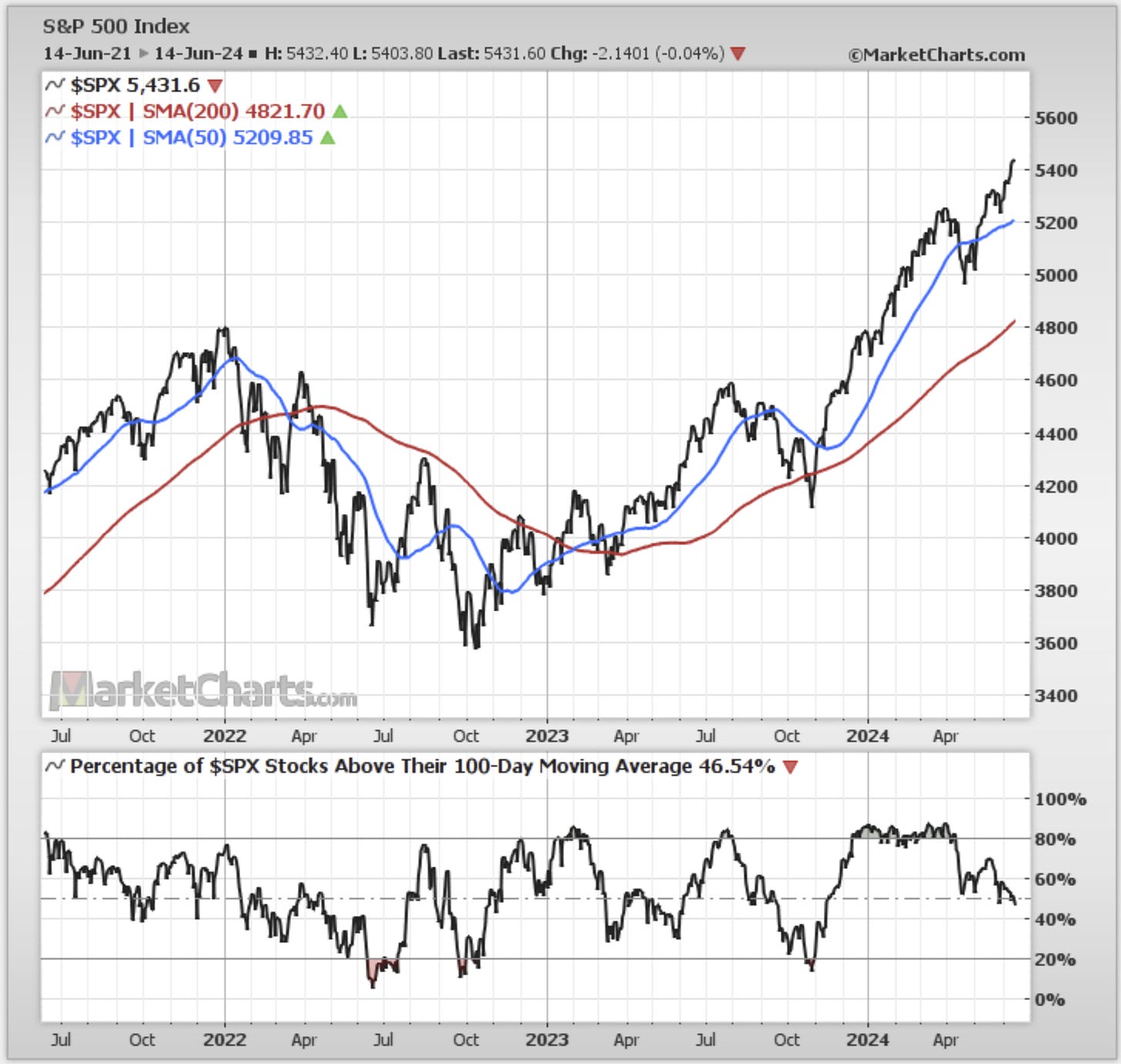 The S&P500 index is looking as strong as ever, it’s broken through multiple overhead resistance levels, and is comfortably above its upward-sloping 50 and 200 day moving averages. The *index* is the epitome of a bull market uptrend. Yet, over half of the 500 companies that make up the index are tracking *below* their 100-day moving averages. It’s a case study in narrow leadership and bearish breadth divergence.