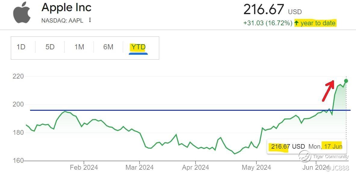 Apple stock is up about +16.72% YTD to $216.67 (as of 17 Jun 2024). (see above)