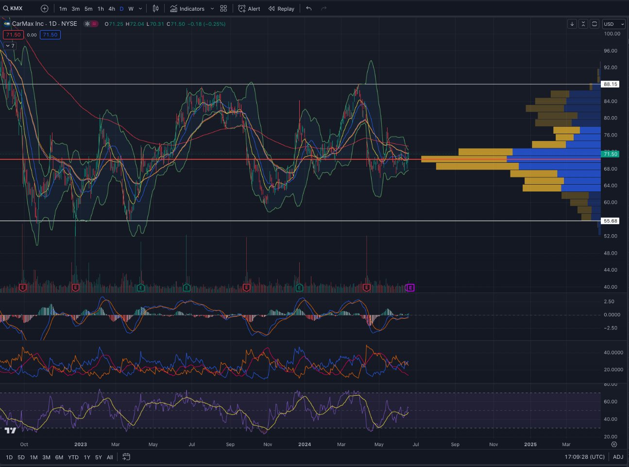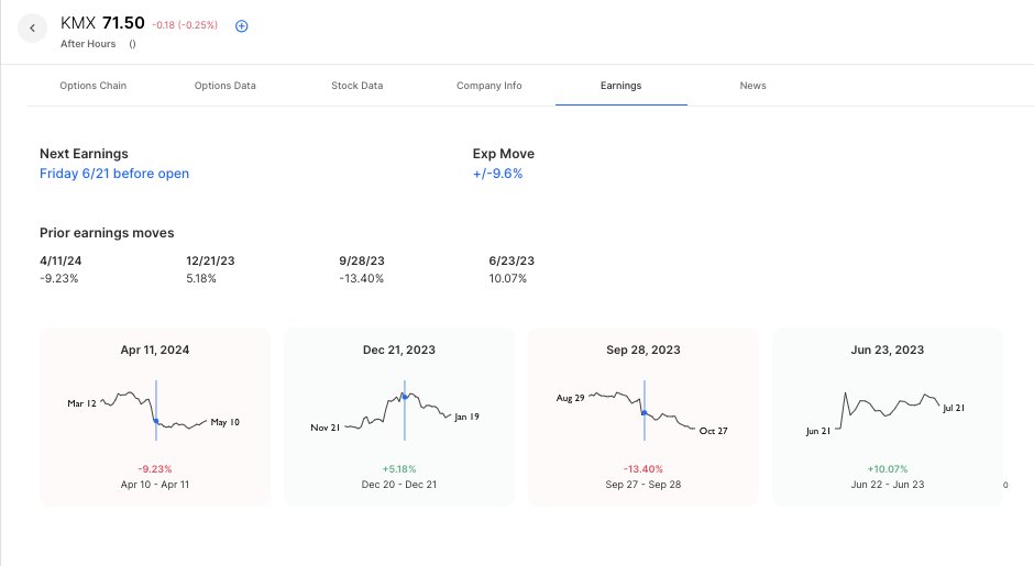 $CarMax(KMX)$ releases earnings on Friday this week. We are contemplating taking a pre-earnings trade.