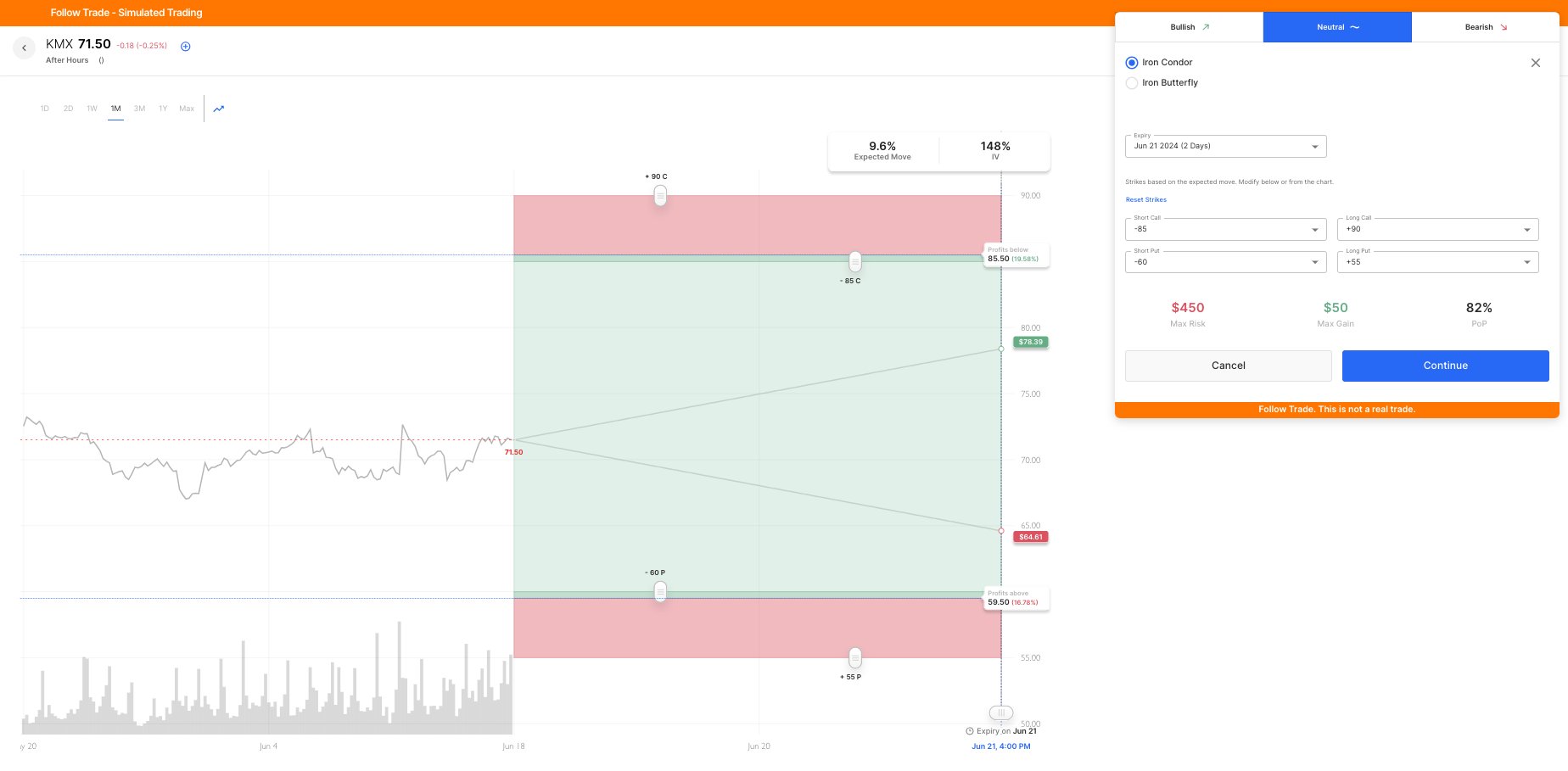 - June 21 expiration, 60/55 put credit spread & 85/90 call credit spread. PoP (probability of profit) for this trade is 82%.