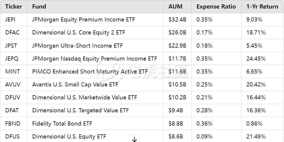 $JPMorgan Equity Premium Income ETF(JEPI)$ $Dimensional U.S. Core Equity 2 ETF(DFAC)$ $JPMorgan Ultra-Short Income ETF(JPST)$ $J.P. MORGAN NASDAQ EQUITY PREMIUM INCOME ETF(JEPQ)$ $PIMCO Enhanced Short Maturity Exchange-Traded Fund(MINT)$ $Avantis U.S. Small Cap Value ETF(AVUV)$ $DIMENSIONAL US MARKETWIDE VALUE ETF(DFUV)$ $Dimensional U.S. Targeted Value ETF(DFAT)$ $Fidelity Total Bond ETF(FBND)$ $Dimensional U.S. Equity ETF(DFUS)$