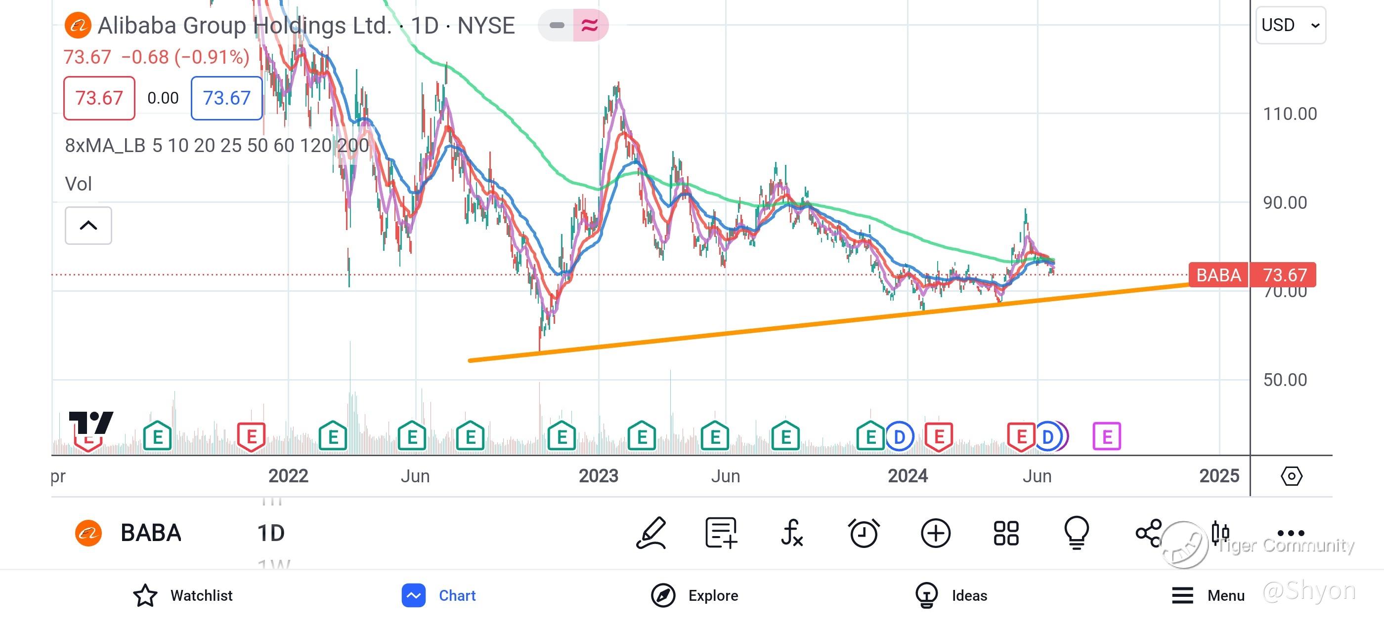 Baba share price retraced since early June and it headed towards a long term trendline support line (as drawn in Orange coloured line in the chart above). This is a strong long-term support line and the share price would probably rebound at there. However, for short term, the share price drops below EMA200 and I believe it will continue to plunge towards the orange coloured line area. Bearish vote for $Alibaba(09988)$ .