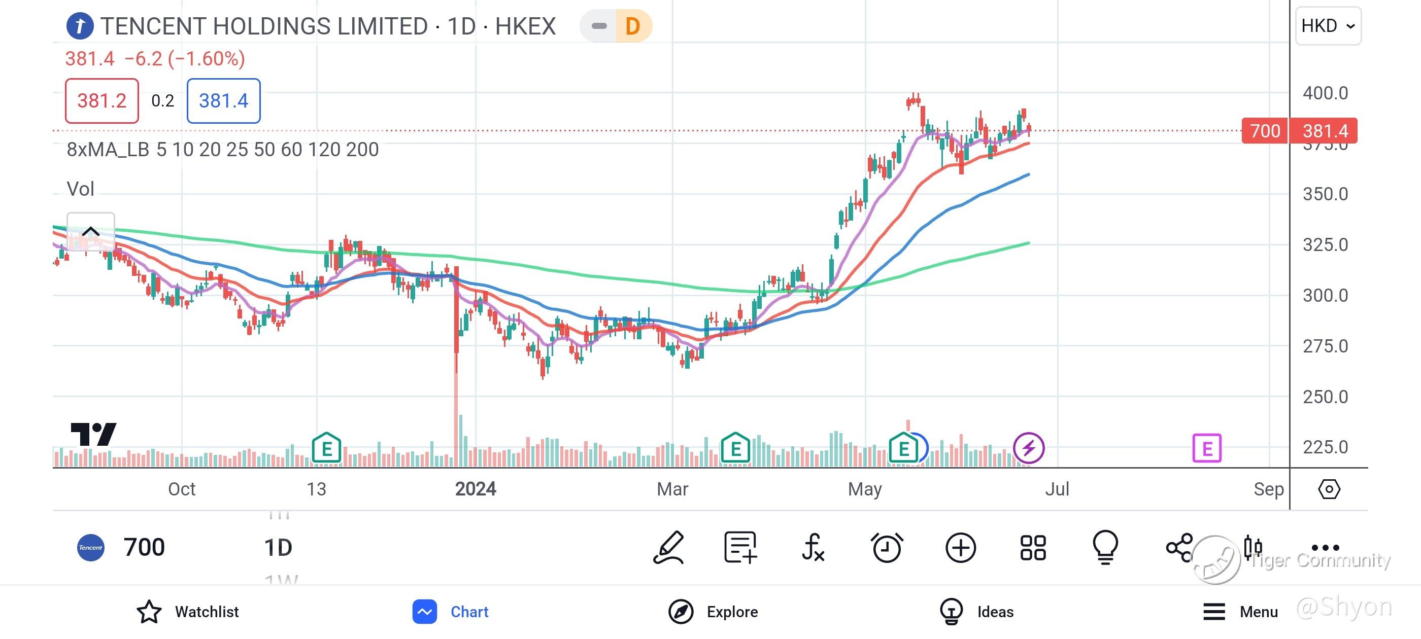 By looking at the technical chart, Tencent is one of the best performing Chinese stocks this year. The rally began in March and sustained until now. In June, the share price took its time to consolidate somewhere around 380 HKD. I believe as long as the share price maintains above the EMA25 trendline support (375 HKD), I believe $TENCENT(00700)$  will slowly head towards 400 HKD and breakout eventually. Let's see.