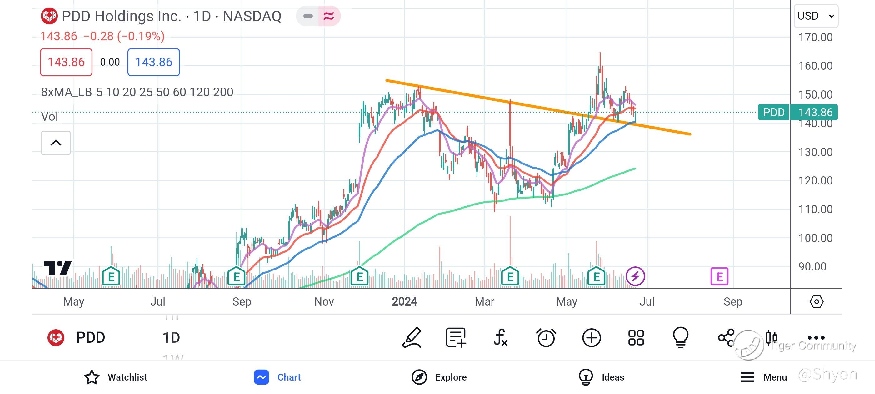 Great breakout for PDD from its downtrend resistance line in mid May 2024. The share price then retraced to retest the support line which was converted from the resistance line previously. It seems like PDD is able to hold well above this support line and tests it twice. Last night, it rebounded again upon touching this line. Everything is still healthy for PDD, therefore a bullish vote for $Pinduoduo Inc.(PDD)$  .