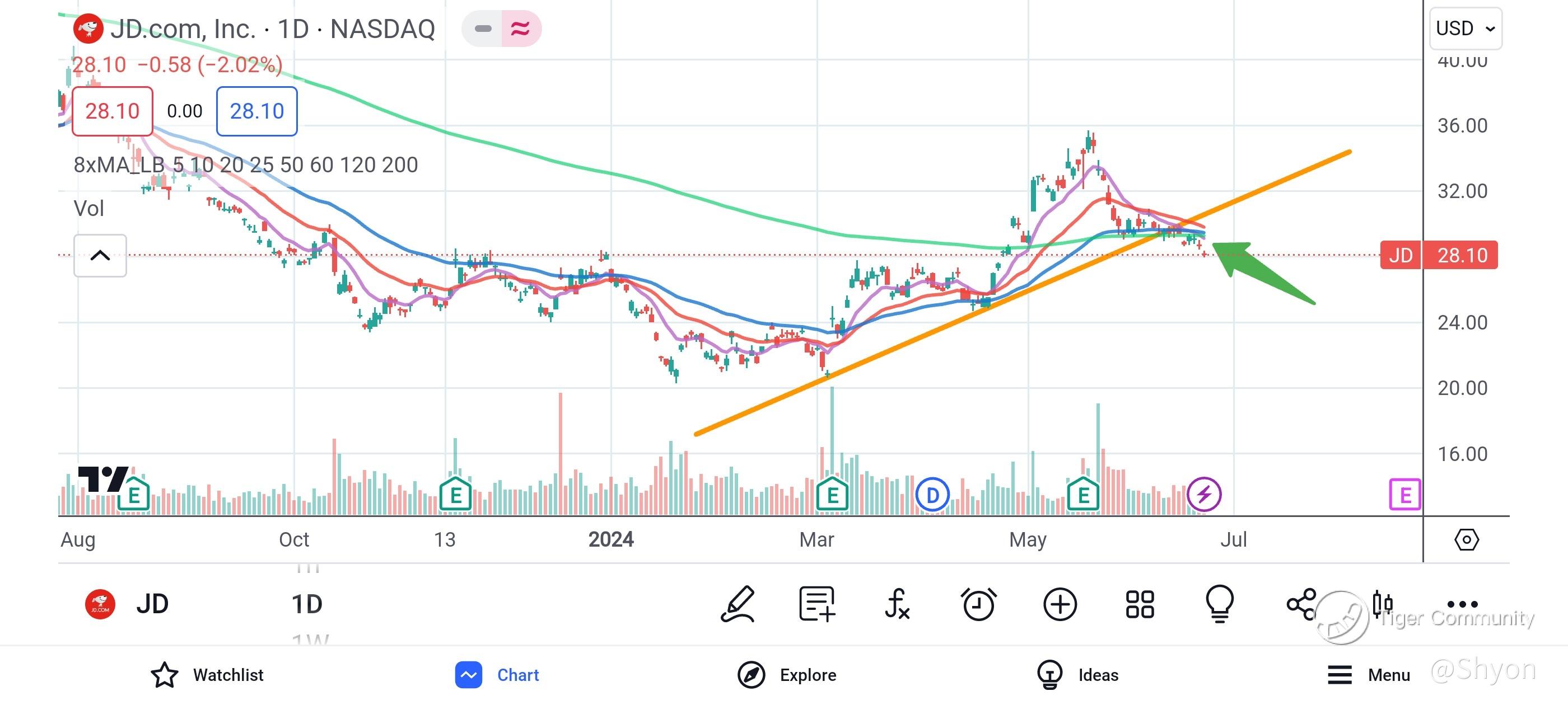 How about JD, one of the PDD and BABA rivals? For JD, the share price had been in an uptrend since March this year and managed to breakout above the EMA200 resistance line in May. However, last week, the share price fell below its orange coloured mid term uptrend line, which might signify the end of this wave of uptrend. Moreover, the share price dropped below its EMA200 trendline as well. Several technical indicators seem to turn bad for $JD.com(JD)$ .