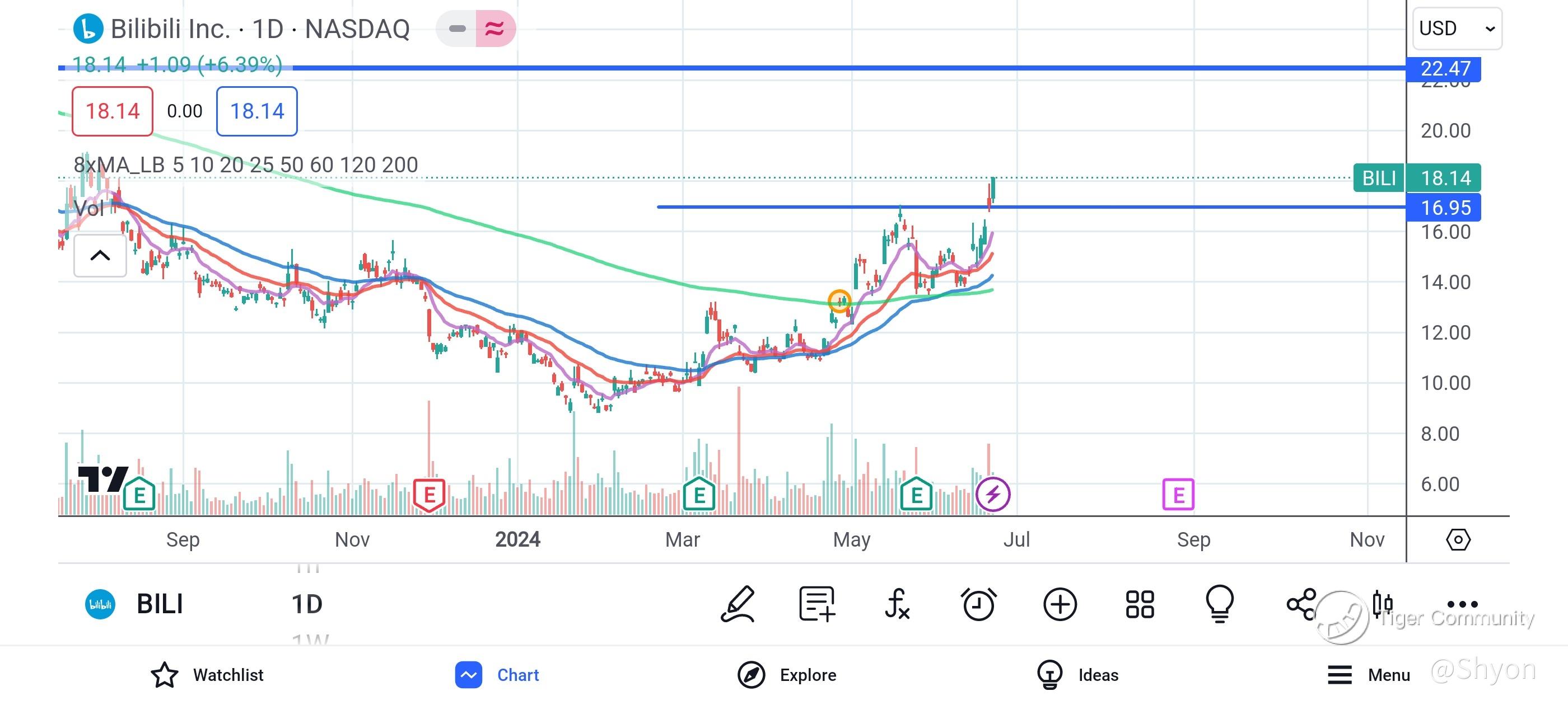 Strong breakout for BILI over its neckline resistance at around 16.95 USD this week! Nothing much to comment for such a bullish stock, we can make the 16.95 USD as short term support and near term target price will be 22.47 USD. With the breakout on 20 June followed by a significant trading volume, $BILIBILI-W(09626)$ will surely continue to trend higher next week.