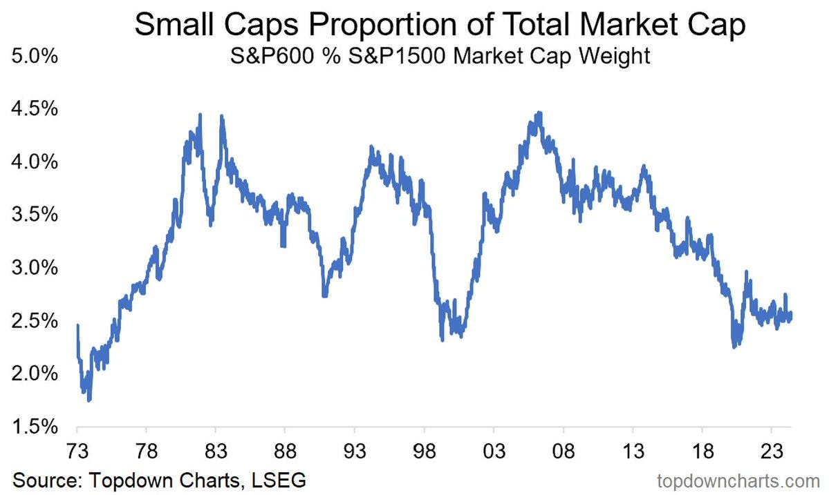 6. Smaller Smalls or Bigger Large? You might argue this is also a sentiment or cycle metric in that small caps have become much smaller than usual in market cap % terms simply because of the band-wagoning into big tech. It also happens that the peaks and troughs in this indicator have also frequently lined up with peaks/troughs in small vs large relative performance.